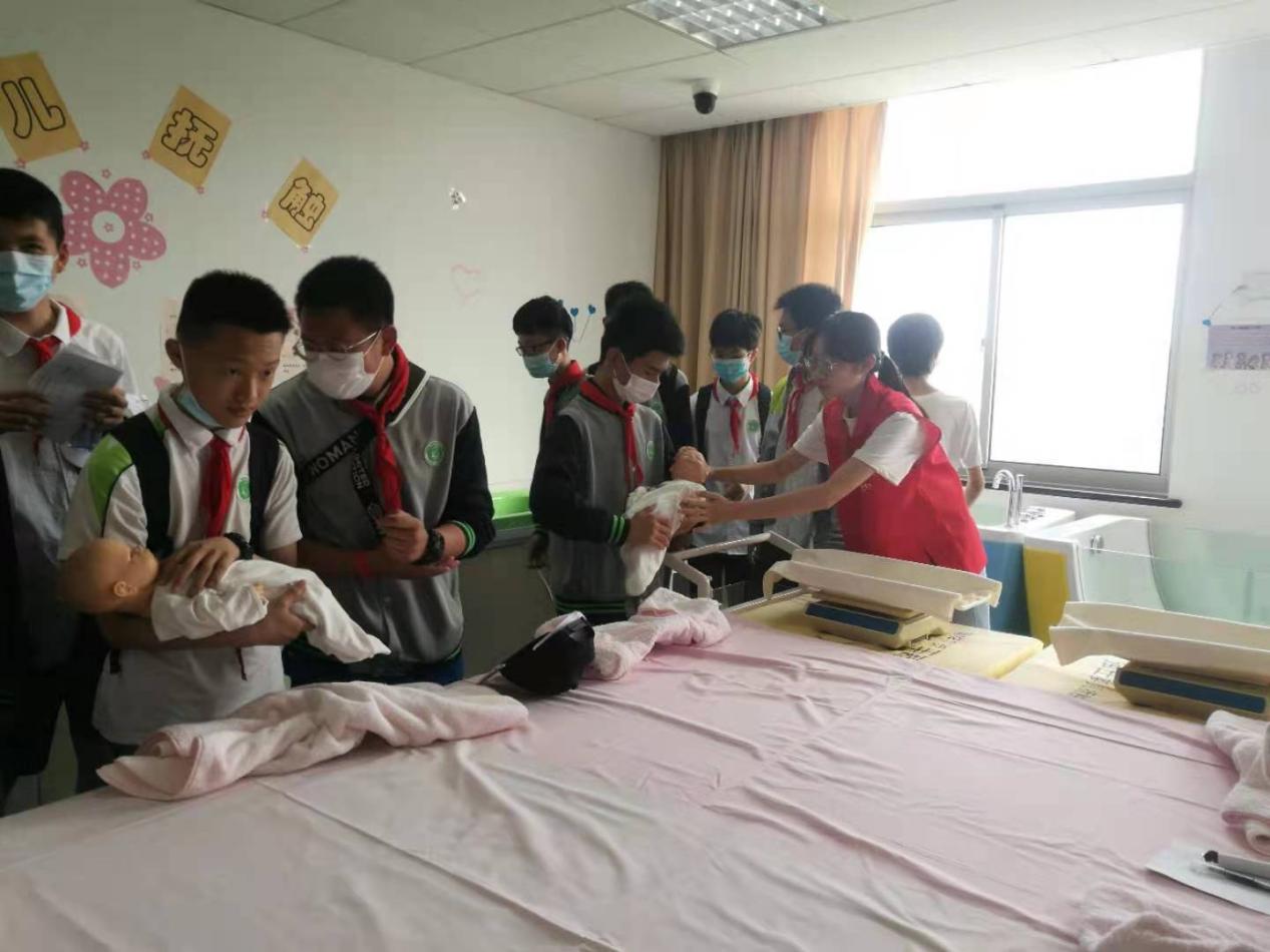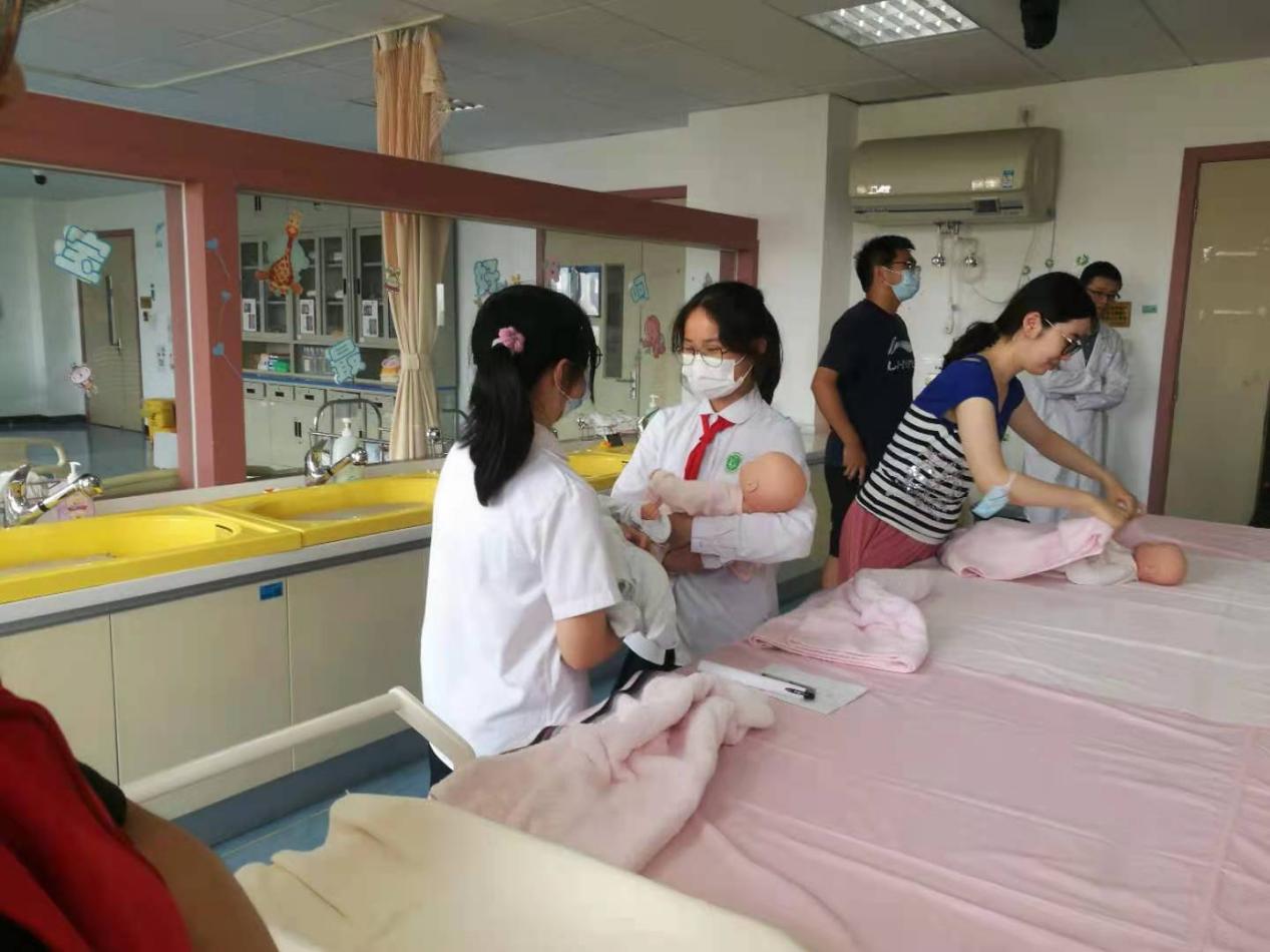 而后,同学们来到了6楼的老年护理的实训教室,6楼模拟了专业的老年护理场所,拥有极其真实的护理急救模拟实训和案例情景教学设施。最后,也是同学们最期待的——5楼的妇儿实训中心。在这里,同学们参观了新生儿沐浴的场所,也学习了抱宝宝的姿势。