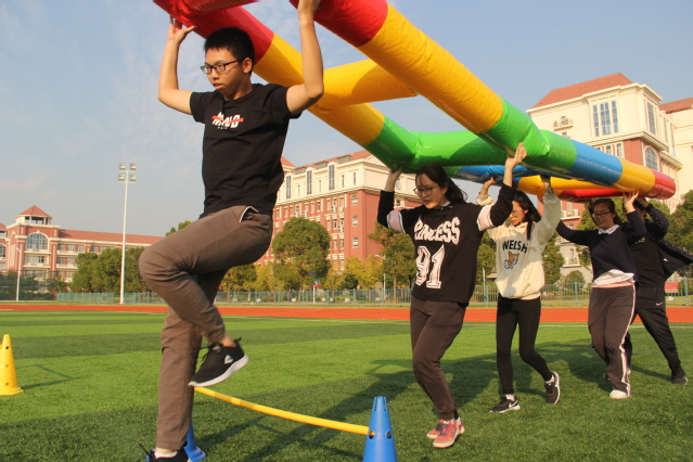 第一项,雷区取水。这个游戏极大地考验了同学们之间的信任度以及合作精神,在一条距离大约1.8米的绳子后有一瓶水,要在不接触地面的情况下取回这瓶水。可能吗?当然可以,但是凭一己之力就是天方夜谭,别忘了这是一个团队游戏。一位同学负责取水杯,身旁的同学固定住他的脚,拉住其一只手,取水杯者身体慢慢向前倾,另一只手努力向前去够水杯,整个人交给了身旁保护的同学!看!大家完成得多棒!