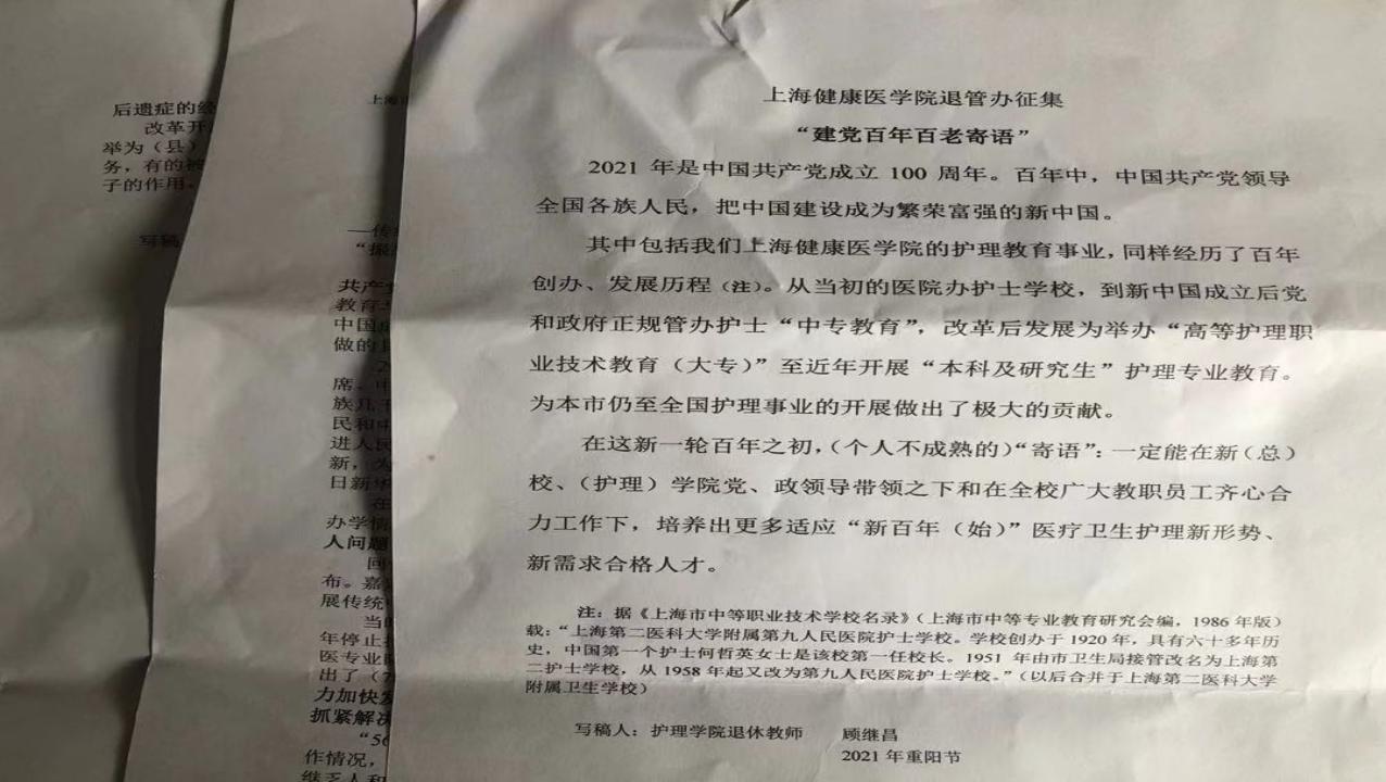 离开吕老师家,来到张虹路顾继昌老师家,为他送上80周岁的生日祝福。顾老师和他爱人感谢公司对他的关心,他以“建党百年百老寄语”为主题写了寄语,亲手交给了前去慰问的老师。他在寄语中写道:“一定能在公司、公司党、政领导带领之下和全体广大教职工齐心合力工作下,培养出更多适应‘新百年’医疗卫生护理新形势新需求下的合格人才”。