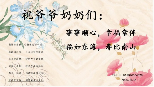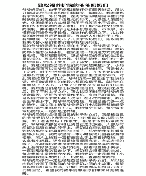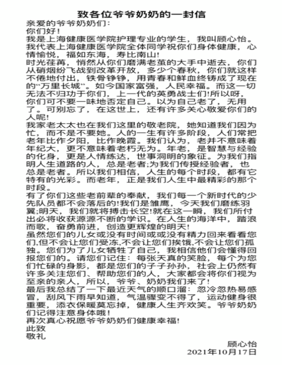 在传统佳节重阳节来临之际,同学们精心准备了一封封信和一张张贺卡,表达着自己对爷爷奶奶们的关怀与温暖,还拍摄了唱歌和快板视频,给爷爷奶奶们带去了轻松与快乐。虽然成员们与爷爷奶奶们无法在线下进行活动,但这些贺卡和视频也同样让老人们感受到了成员们的热情与关怀,使老人与成员们的感情更加深厚。