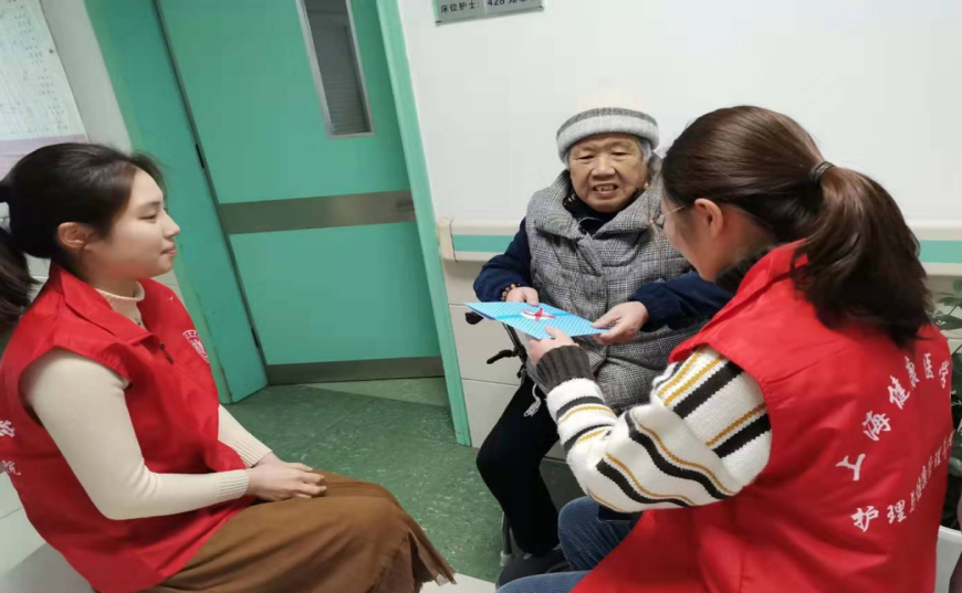 针对不同老人不同的性格和兴趣爱好,安排不同的队员与老人进行沟通交流,陪伴老人聊天,缓解老人住在病房的苦闷。对于特殊的病人,志愿者们采取安抚式陪伴,通过给老人播放音乐,或者抚摸他们的手让他们感受到我们的陪伴与关怀。同时为了让住院的老年病患在节假日也能感受到温暖的节日氛围,长征分队在重阳节也来到这里,为老人送上精美的贺卡,并送上节日的祝福,让老年人感受到温暖和爱。