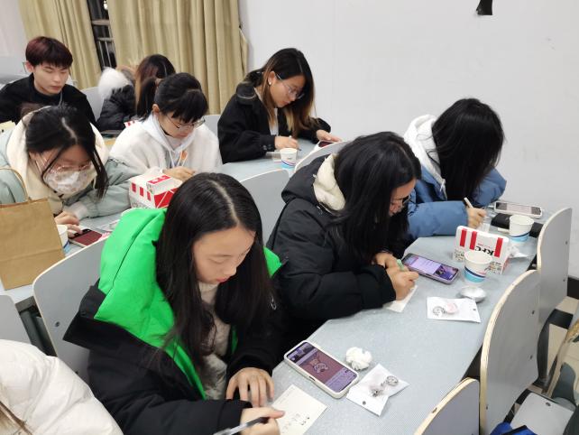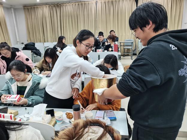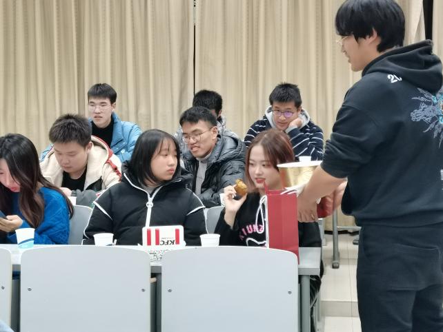 班会正式开始,班委们为大家准备了肯德基和肥宅快乐水,大家沉浸在享用美食的快乐中。