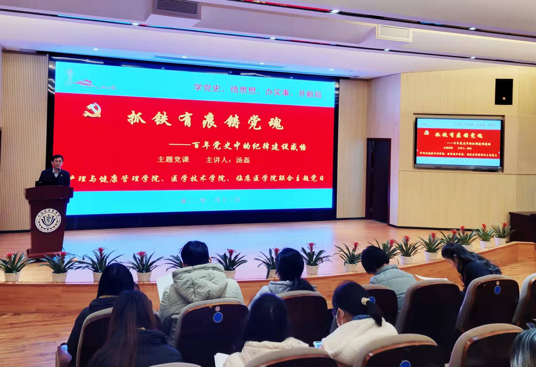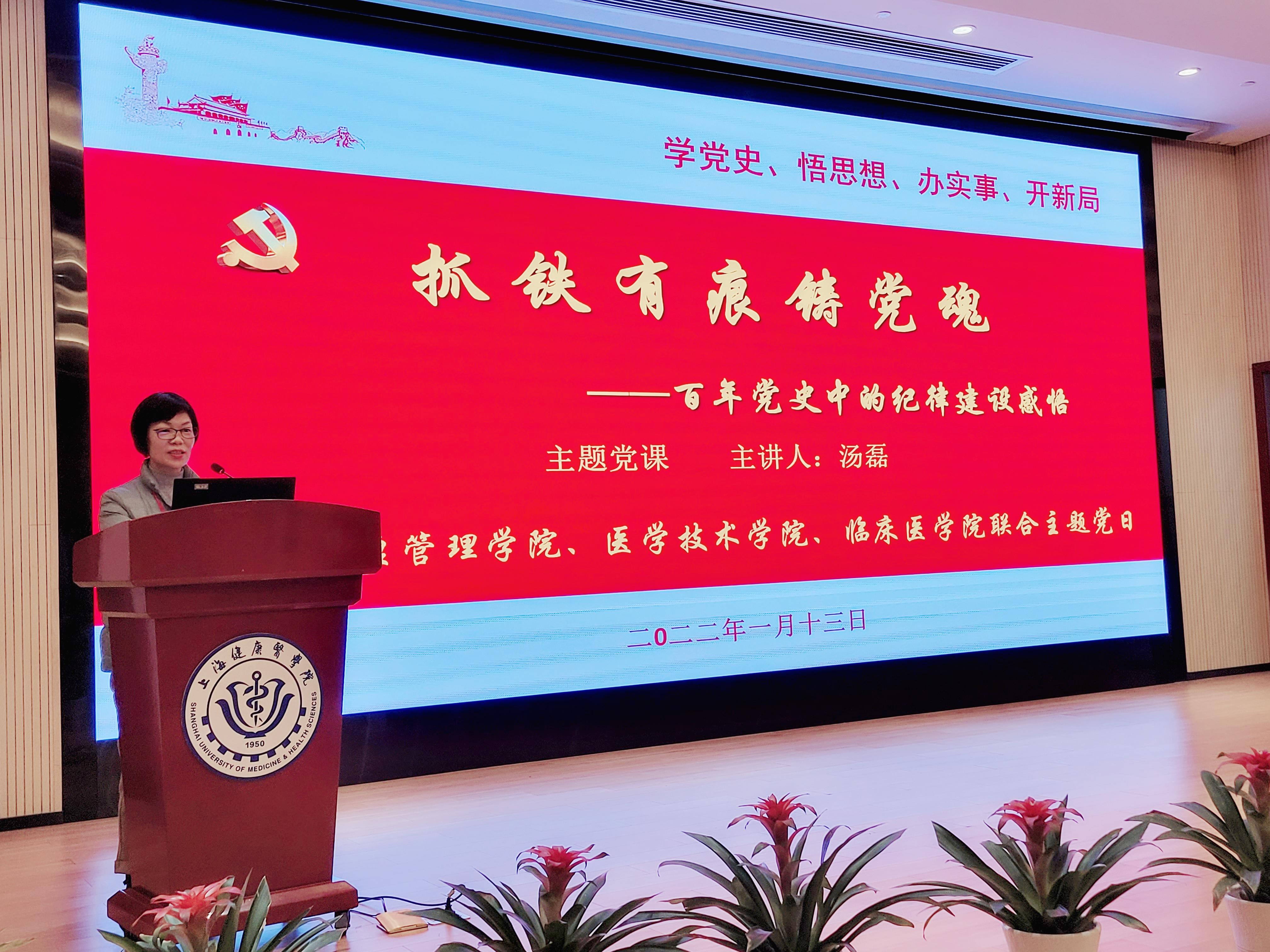 1月13日下午,护管、医技和临床医公司党总支在北苑1号楼200人报告厅联合举办《百年党史中的纪律建设感悟》主题党日,公司党总支书记汤磊做主题党课,医技公司党总支书记刘敏娟和临床医公司党总支书记蔡巧玲做交流发言,三个公司的师生党员和理论学习中心组成员共同参加了学习,此次活动由汤磊主持。