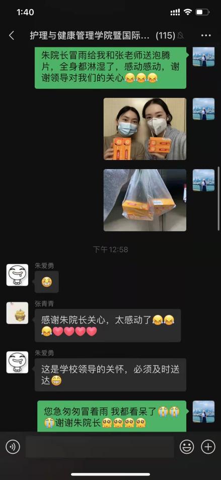 “国之大者,心系人民”。同时,朱经理每天都会登录校园网、访问校园论坛、走进员工微信群、教师微信群,关心关注疫情防控下,校内校外师生、隔离员工和闭环管理员工的思想动态,确保思想稳定。对生活困难师生,他格外关注、格外关心、格外关爱,帮助他们排忧解难,及时调动生活物资,提供帮助。织密疫情防控安全保障网,为师生生活安康托底。