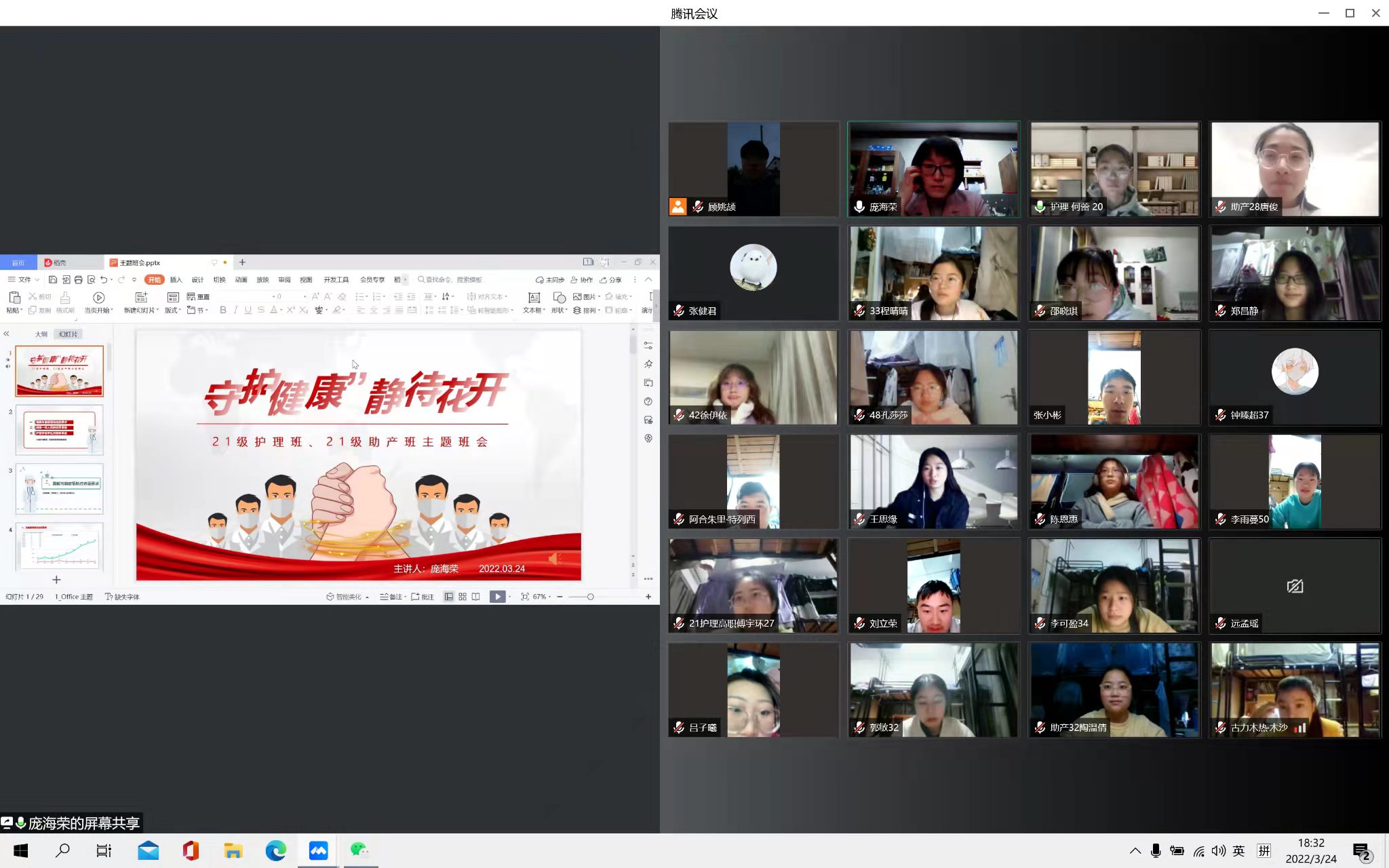 3月24日晚,辅导员庞海荣老师召集21级护理(高职)班和21级助产(高职)班的员工们通过腾讯会议的方式召开“守护健康,静待花开”的主题班会,强调在疫情防控期间,大家要严格遵守公司各项规定、一切行动听指挥”,号召大家齐心协力、共克时艰。全体同学都准时上线、认真聆听了此次班会。