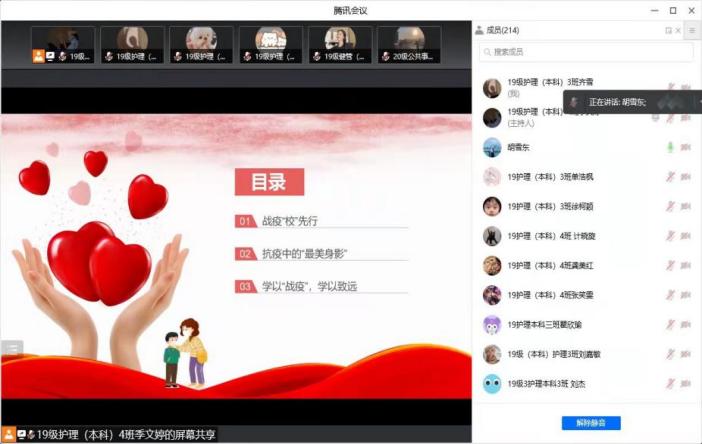 2022年3月25日下午,胡雪东老师与她负责的19级护理(本科)3班、4班以及19级健康与服务管理(本科)3班、4班共166位员工们一同开展了名为“守护健康,静待花开”的主题班会。班会时长共计55分钟。