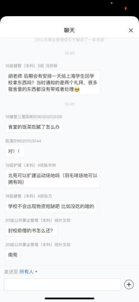 会议的最后,老师为大家提供了分享问答时刻。19级健管(本科)4班的施婕主动为大家分享了疫情期间为小区核酸检测志愿者出力的事迹。另有多名同学提出了有关校内外疫情防控的问题,胡老师均耐心地答复,解除了同学们的困惑。