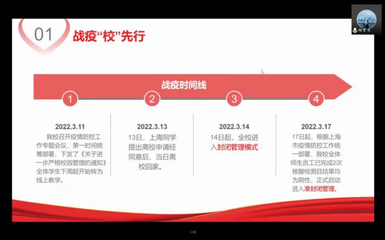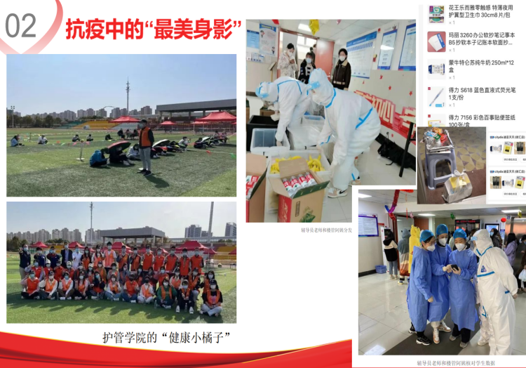 接着,告诉各位同学疫情当前,公司在做着不懈努力的同时,公司健康学子们也都积极参与到志愿者的行列当中去。并通过图文讲解了伟德bv国际体育官方网站的同学们主动报名参与校核酸检测志愿者团队、顶着烈日维持核酸秩序以保证工作正常进行的事迹以及护管各个班级的辅导员老师们主动留校为包括实习生在内同学们所做各类力所能及之事,如发放物资、核对员工核酸信息、慰问关心,尽力满足校内员工的各项需求。并请到了20级公共事业管理专业的两名同学——熊自强和施轶珺,来讲述他们在此次疫情发生后主动请缨参与浦东疾控中心流调志愿者工作中发生的故事及感悟。在他们流调过程中,很艰辛、有被误解,但也有被尊重、敬佩,同学们从他们的故事中,能感受到吾辈青年的成长与力量。老师总结道,护管与公卫学子在公共卫生事件发生的特殊时期,用实际行动为疫情防控贡献了一份自己的青春力量,他们都起到了模范带头作用,他们都是抗疫中的“最美身影”!