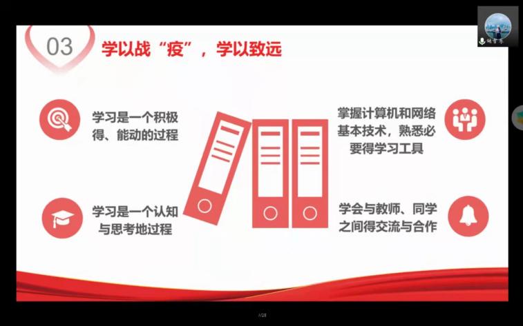 之后,老师向同学们强调了疫情期间做好自我防护的几点注意事项,让同学们感受到防疫重要性,并鼓舞大家在有余力、形势适合的情况下,向那些勇于挺身而出的志愿者榜样们学习,积极参与校内或家附近街道的志愿者团队,为抗疫贡献自己的一份力。并根据同学们目前线上学习时产生的一些问题提出了几点建议,告诫大家要克服自己的惰性心理,发挥自主学习的能力,配合老师完成各项学习任务,努力提升自我,为了自己的未来、祖国的将来而不懈努力!