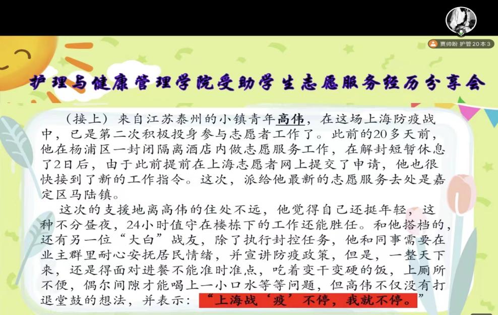 4月17日晚,护理与健康管理公司受助员工服务队组织了“共克时艰,守护‘健康’”志愿服务分享会,共有430人参加了线上腾讯会议。