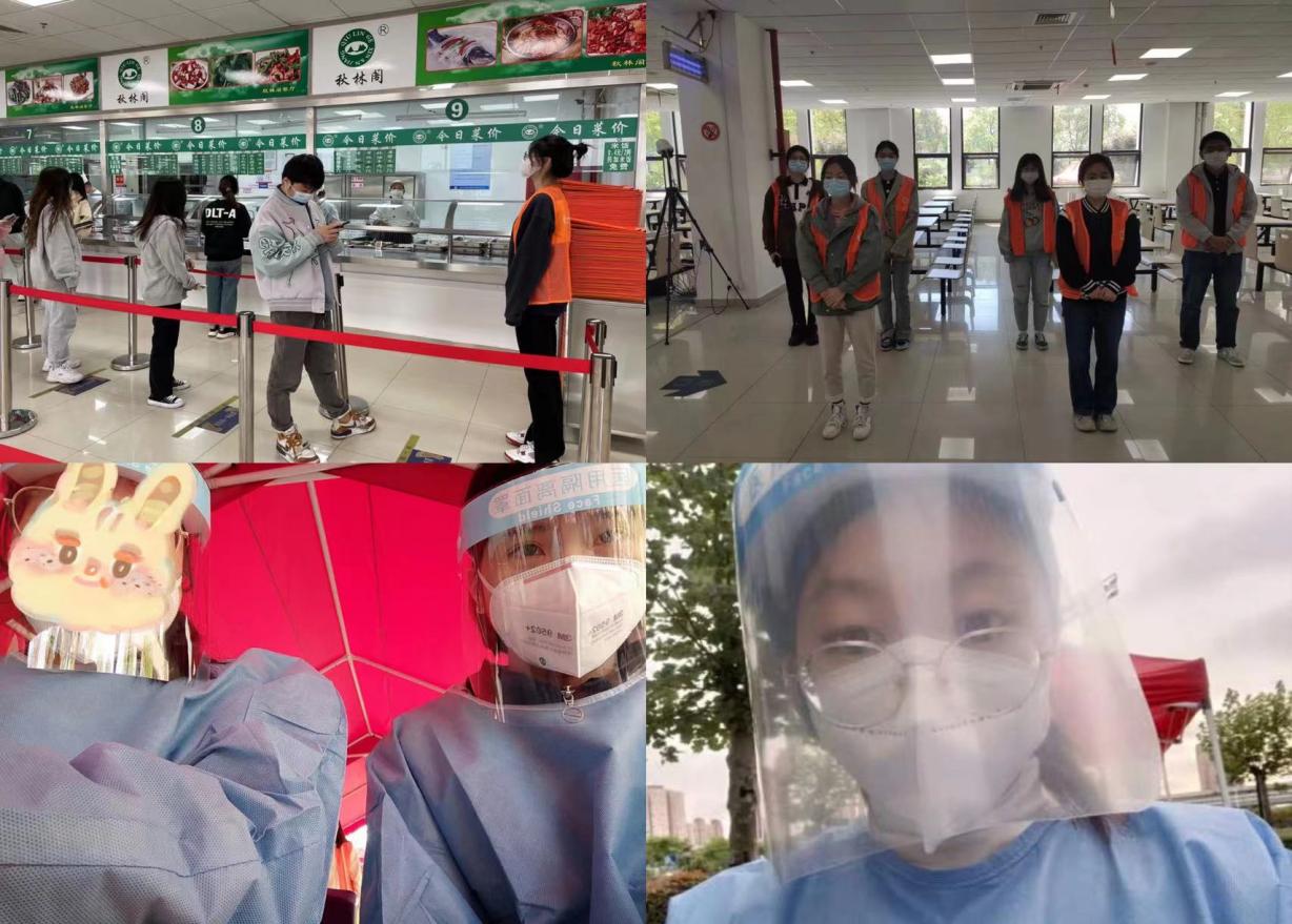 在辅导员杜学礼老师的感召、班委集体的模范带头下,20级助产班的同学闻令而动、主动请缨,留守公司的53名同学中有39人主动报名,在志愿者登记表上留下了自己的联系方式,并集体表示服从志愿者老师及员工负责人的安排,积极投身到公司的各个岗位中去。如赵伊利同学作为餐饮志愿者,负责天猫超市的限流工作等工作;徐露佳同学加入了南苑餐饮志愿者服务组,承担着对食堂二楼排队进行人员疏导的任务,让买饭的同学保持“安全距离”,她们心中有爱、眼中有光,为校园疫情防控默默的贡献着自己的力量。随着校园疫情防控形势的陡然突变,南苑9号楼开始实施封闭化管理,同学们在无法外出的情况下,大家又在宿舍楼里主动的做起了志愿者,如朱筱雯同学不畏风险、踊跃报名,成为9号楼核酸扫码志愿者,维持核酸检测秩序;赵雪如和徐欣然同学迎难而上,与其他志愿者默契协作,分别负责给9号楼3层和11层的同学发餐、引导同学们做核酸检测等工作;申桂香同学临危不惧、承担起了9号楼全体同学的核酸签到等任务。她们用责任与汗水诠释着“青春”的力量,于疫情一线绽放她们的铿锵芳华。同学们这种大无畏的精神、勇于奉献的实际行动,得到了校团委的高度肯定和表扬。