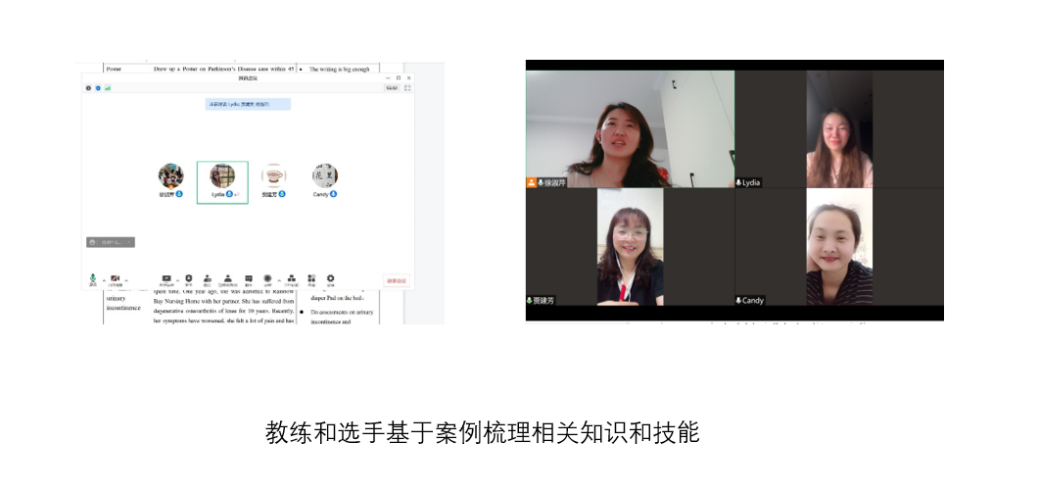 教练团队通过腾讯会议等现代化平台对选手开展线上集训。由教练根据案例扮演SP,选手对SP进行“云端”照护,教练针对选手在训练过程中表现出的不足之处进行专题讲解和拓展,提出需要进一步思考的问题和方向,供选手进行自我提升和完善。经过反复雕琢,最终达到满意效果,为在5进1的考核中取得优异成绩打下坚实基础。