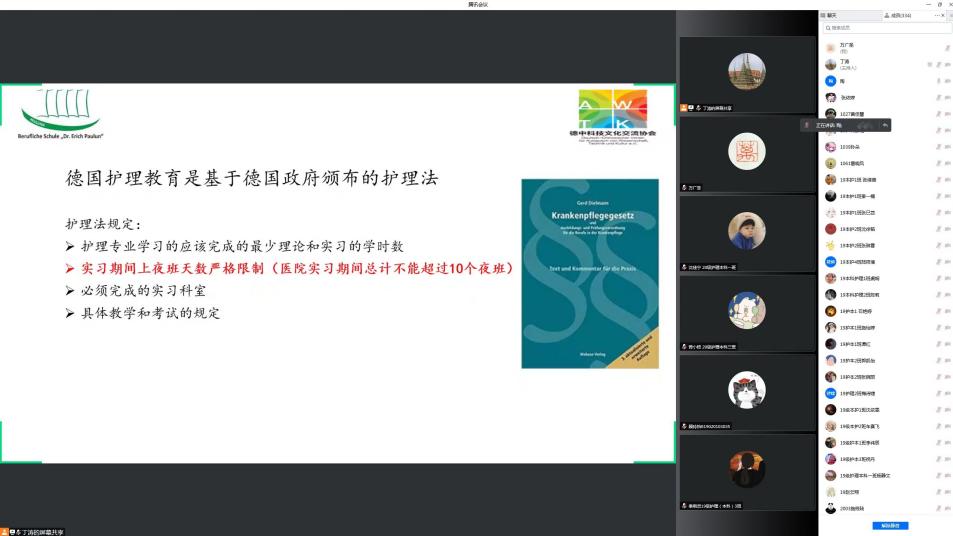 为拓展护理专业员工国际视野,培养国际化的护理专业人才,4月10日晚,伟德bv国际体育官方网站为本院2019、2020级护理专业本科员工组织了一次主题为“德国护理教育发展现状及护理职业发展介绍”的线上交流会。本次交流会由伟德bv国际体育官方网站外事办卜佳老师主持,首先,万广圣副经理介绍了参加与会的嘉宾,并对举办本次交流会的目的进行了介绍。其次,身处德国的陶兴煜会长对德国护理教育体系发展现状之后职业发展领域等内容做了详细介绍。再次,丁涛秘书长对德国宝隆护理项目进行了介绍,并与参会同学们进行互动交流。