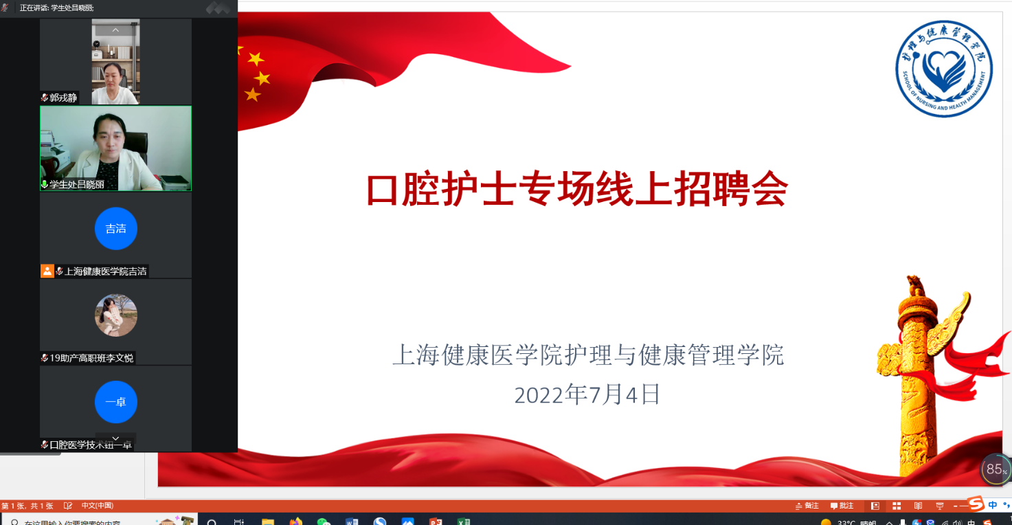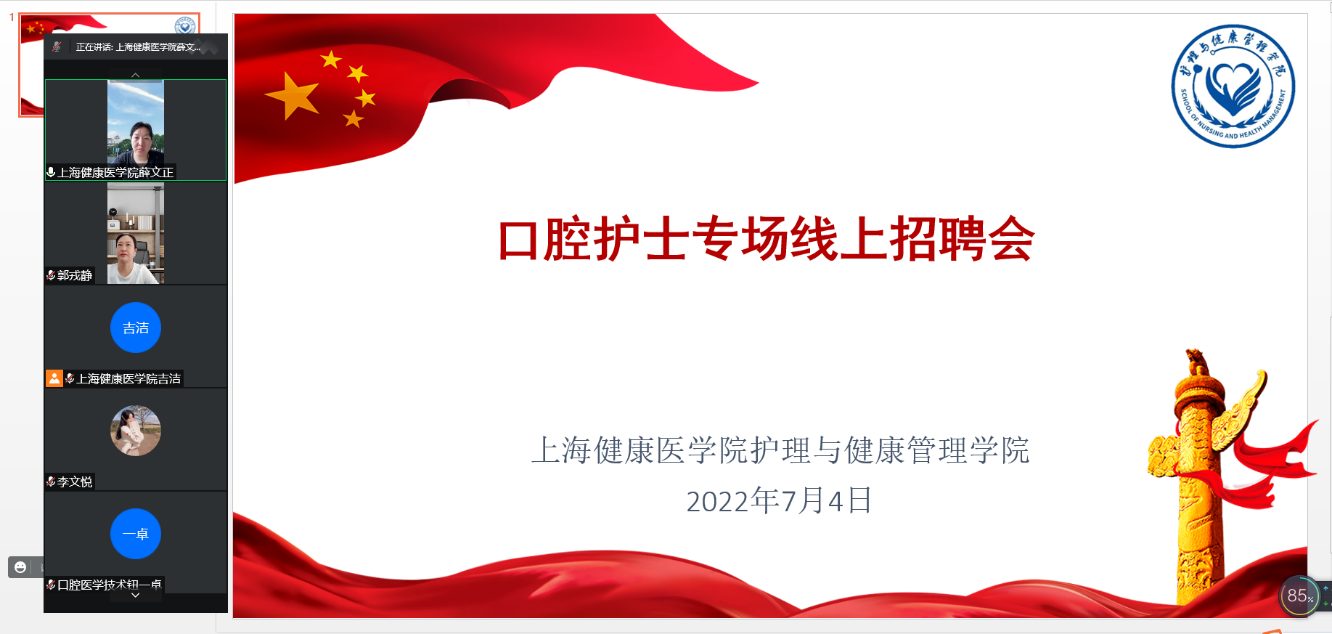 为了深入推进“互联网+就业”模式,为用人单位和员工搭建平台,公司于202274日下午举办了口腔护士专场线上招聘会。上海雅洁口腔医院有限公司、上海极橙医疗科技有限公司、上海意云口腔门诊部、鼎植医生集团(深圳)有限公司、众合口腔门诊部的人力资源部分负责人莅临了本次会议,公司员工处吕晓丽副处长(主持工作)、祁志波科长、​伟德bv国际体育官方网站郭戎静书记、薛文正副书记和2022届毕业班辅导员们共同参加了本次会议。会议由伟德bv国际体育官方网站薛文正副书记主持。